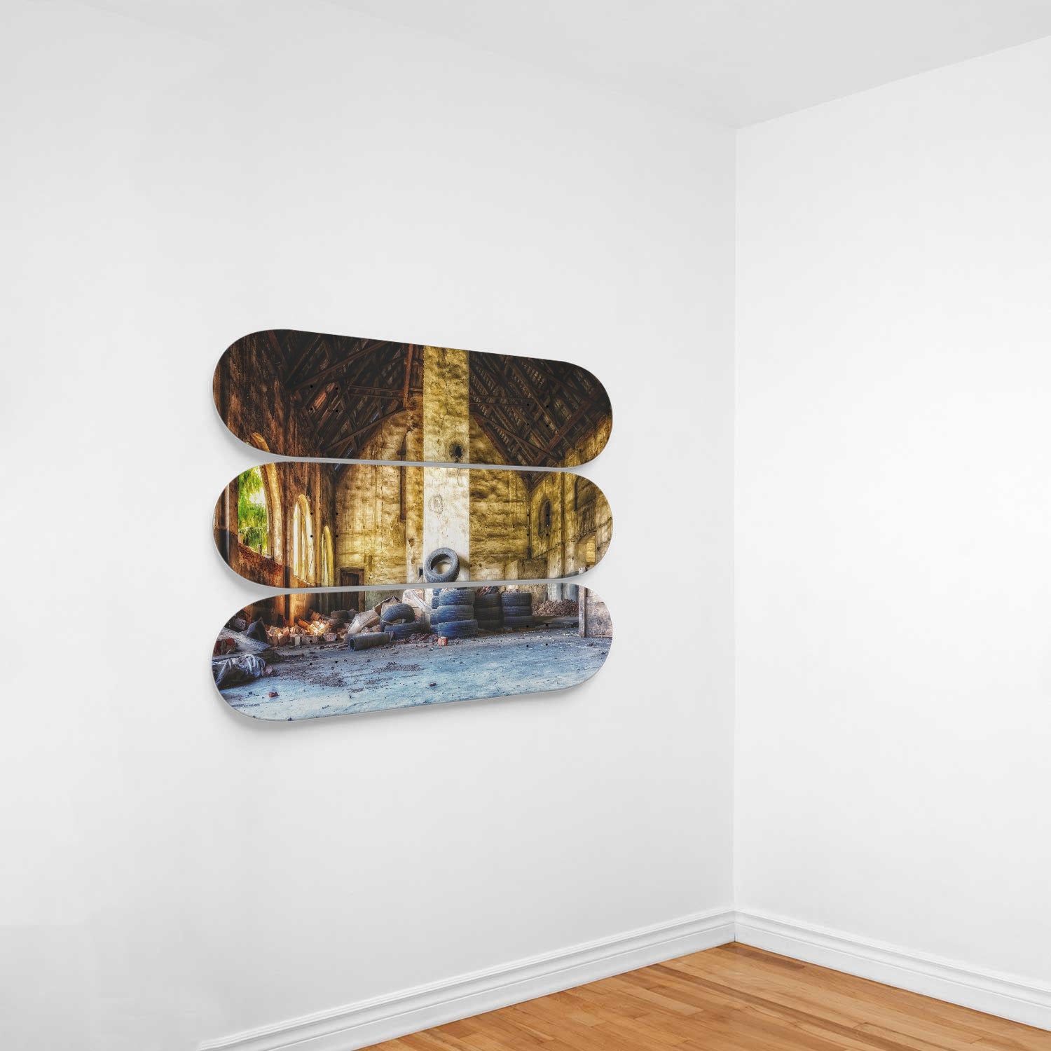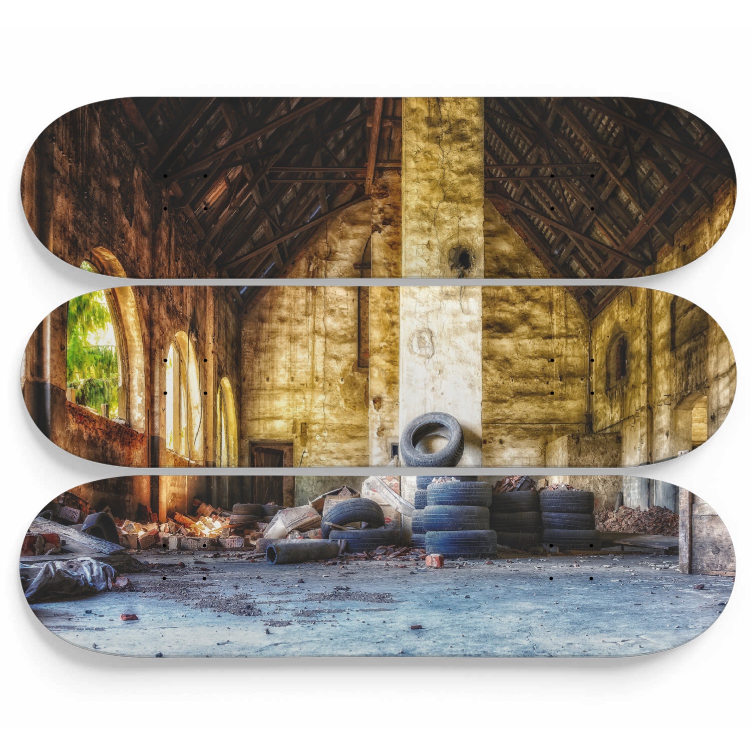 This set of 3 high-quality 7-ply 100% maple skateboards are the perfect statement piece for any home or office. Custom printed graphics, one-of-a-kind art piece.