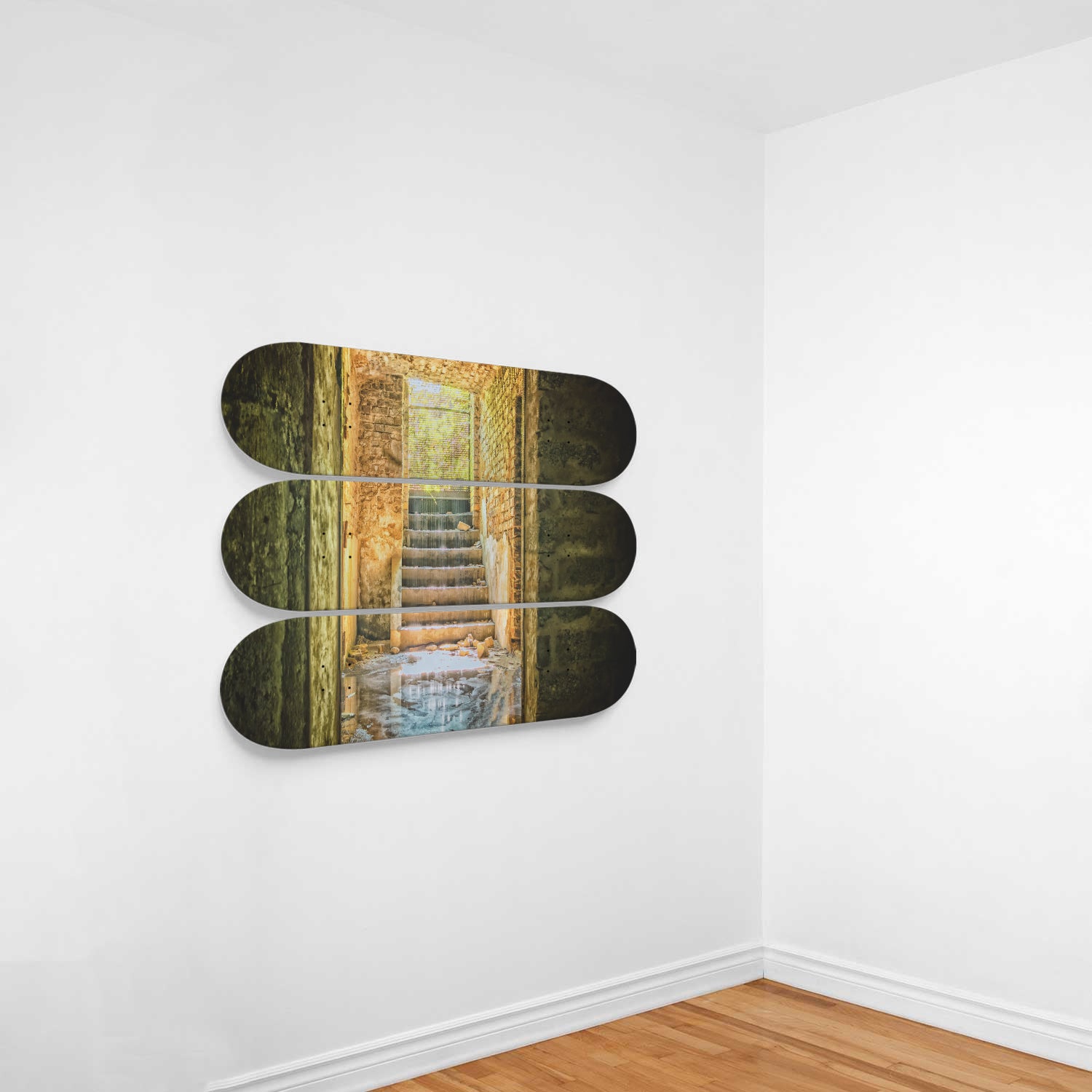 This set of 3 high-quality 7-ply 100% maple skateboards are the perfect statement piece for any home or office. Custom printed graphics, one-of-a-kind art piece.