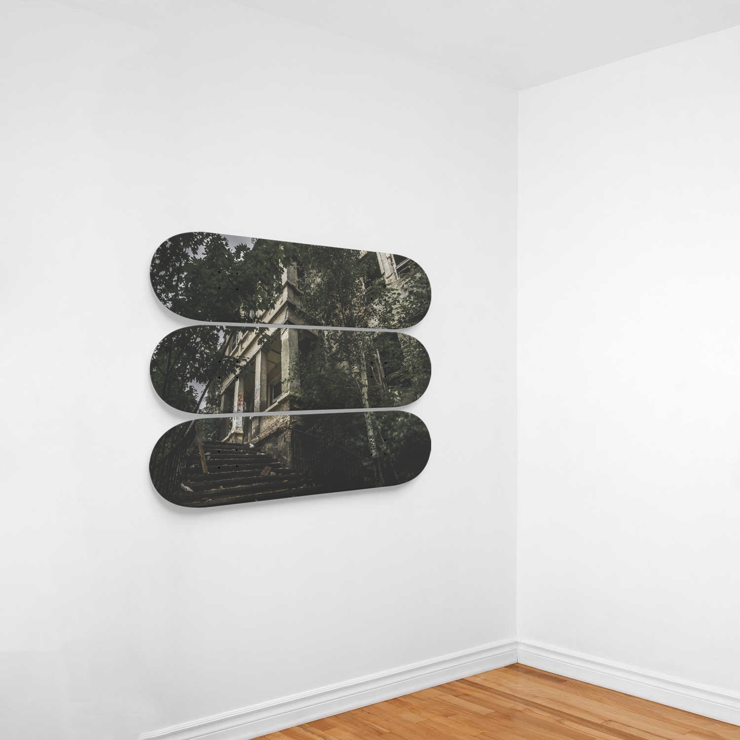 This set of 3 high-quality 7-ply 100% maple skateboards are the perfect statement piece for any home or office. Custom printed graphics, one-of-a-kind art piece.