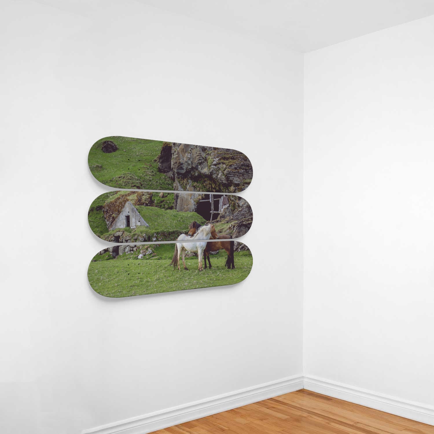 This set of 3 high-quality 7-ply 100% maple skateboards are the perfect statement piece for any home or office. Custom printed graphics, one-of-a-kind art piece.
