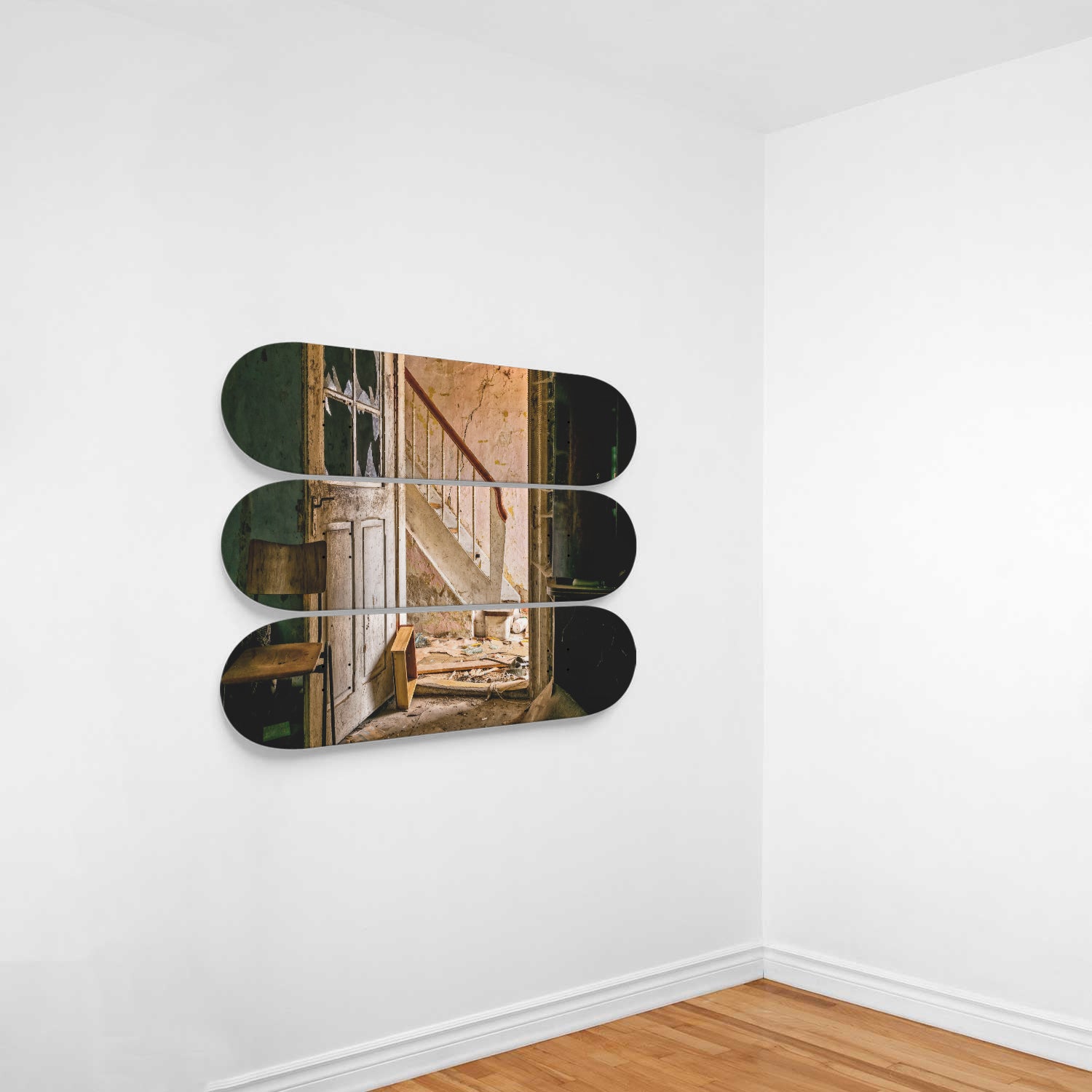 This set of 3 high-quality 7-ply 100% maple skateboards are the perfect statement piece for any home or office. Custom printed graphics, one-of-a-kind art piece.