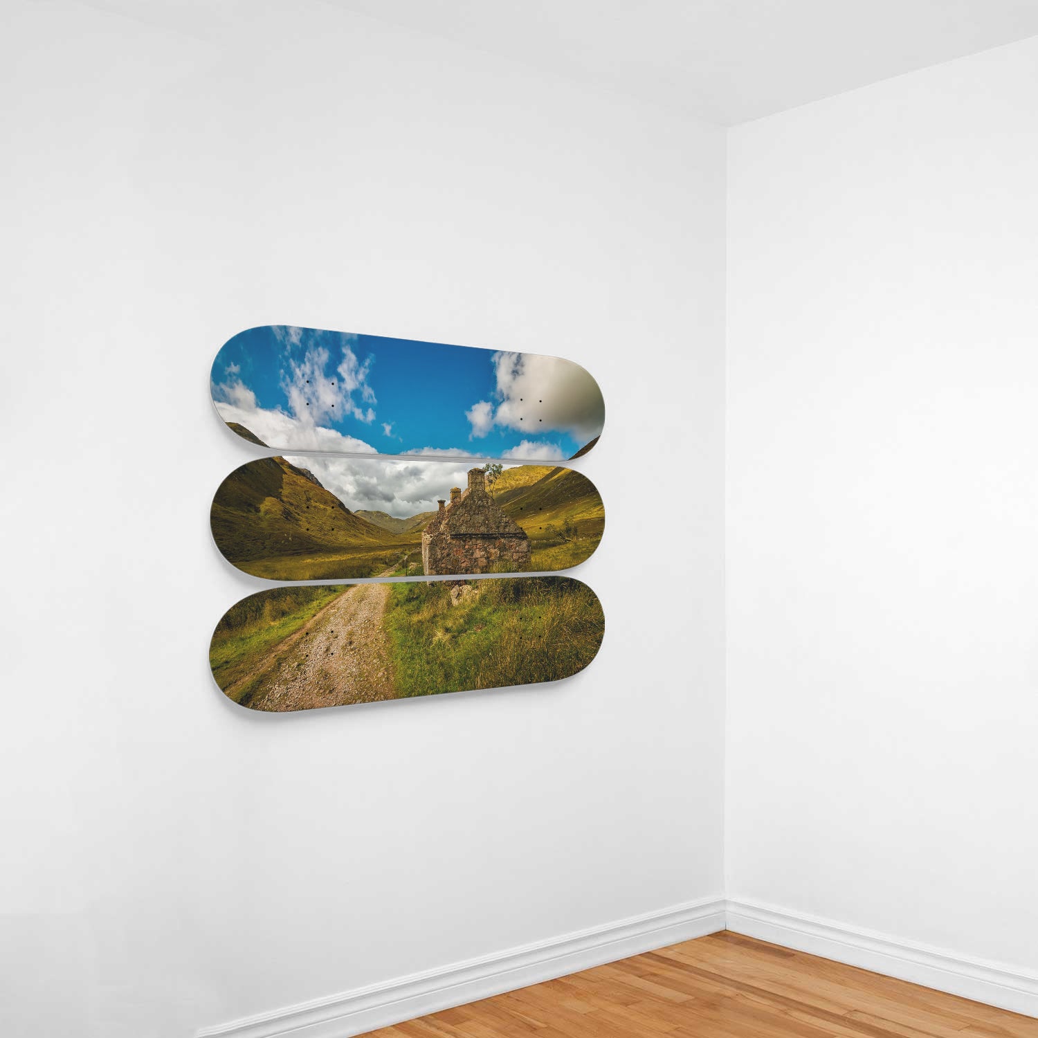 This set of 3 high-quality 7-ply 100% maple skateboards are the perfect statement piece for any home or office. Custom printed graphics, one-of-a-kind art piece.