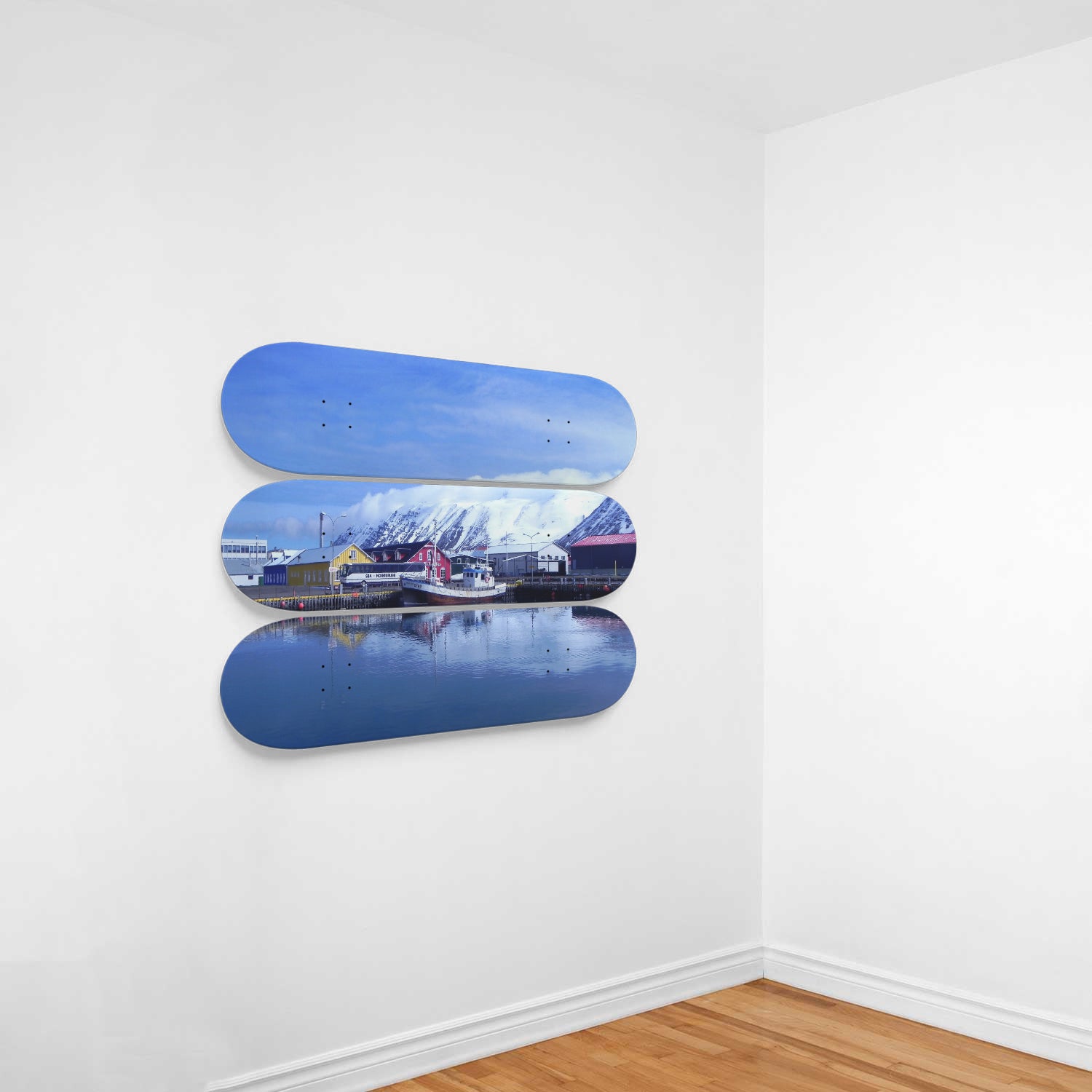 This set of 3 high-quality 7-ply 100% maple skateboards are the perfect statement piece for any home or office. Custom printed graphics, one-of-a-kind art piece.