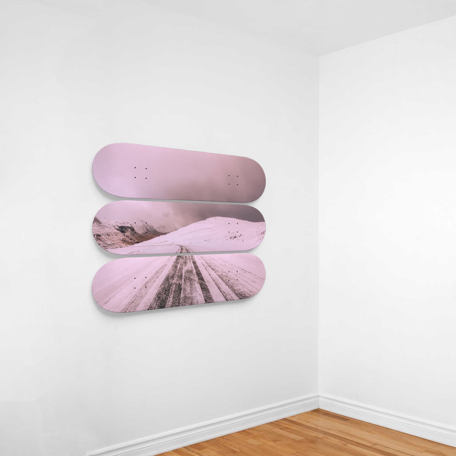 This set of 3 high-quality 7-ply 100% maple skateboards are the perfect statement piece for any home or office. Custom printed graphics, one-of-a-kind art piece.