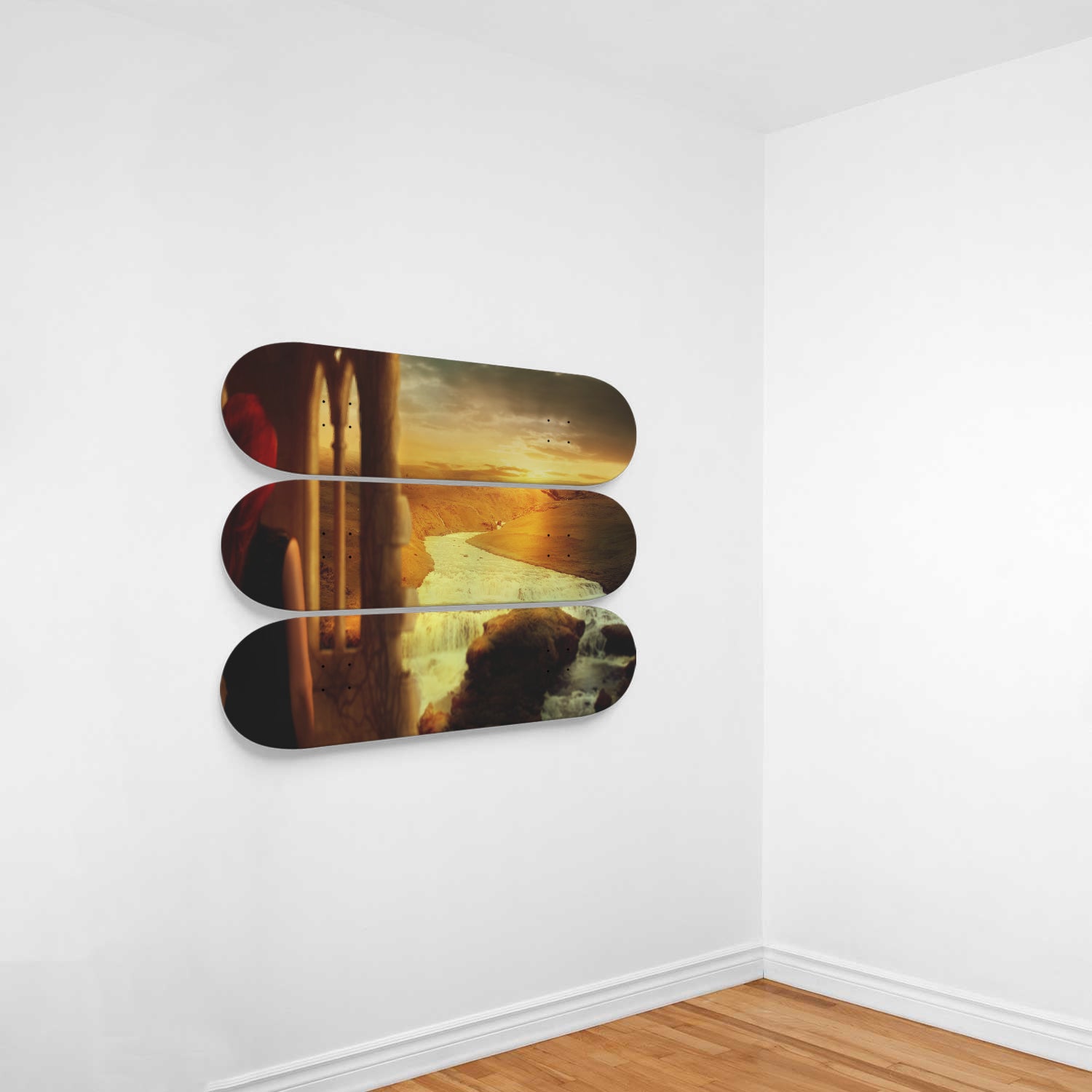 This set of 3 high-quality 7-ply 100% maple skateboards are the perfect statement piece for any home or office. Custom printed graphics, one-of-a-kind art piece.