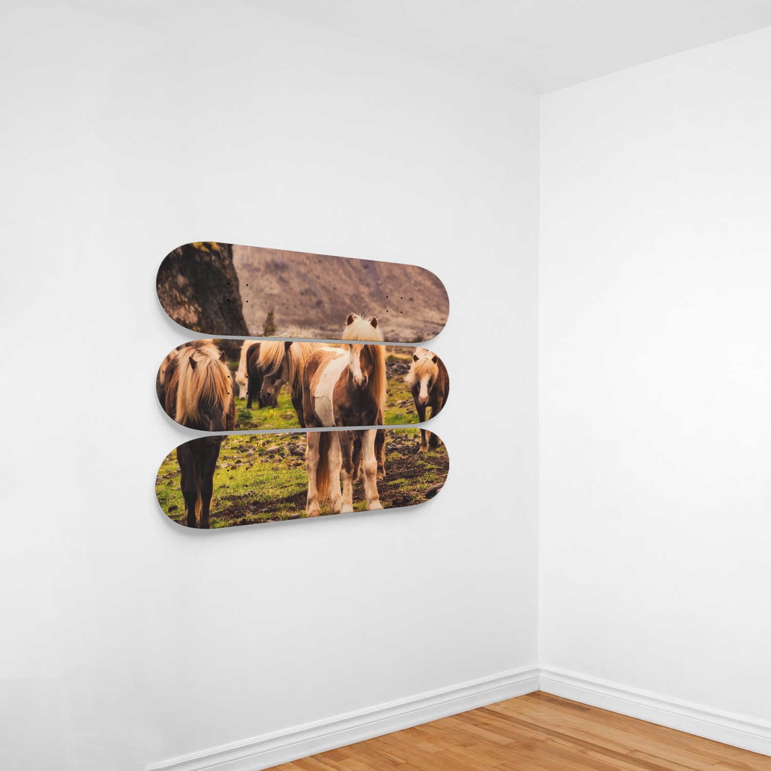This set of 3 high-quality 7-ply 100% maple skateboards are the perfect statement piece for any home or office. Custom printed graphics, one-of-a-kind art piece.