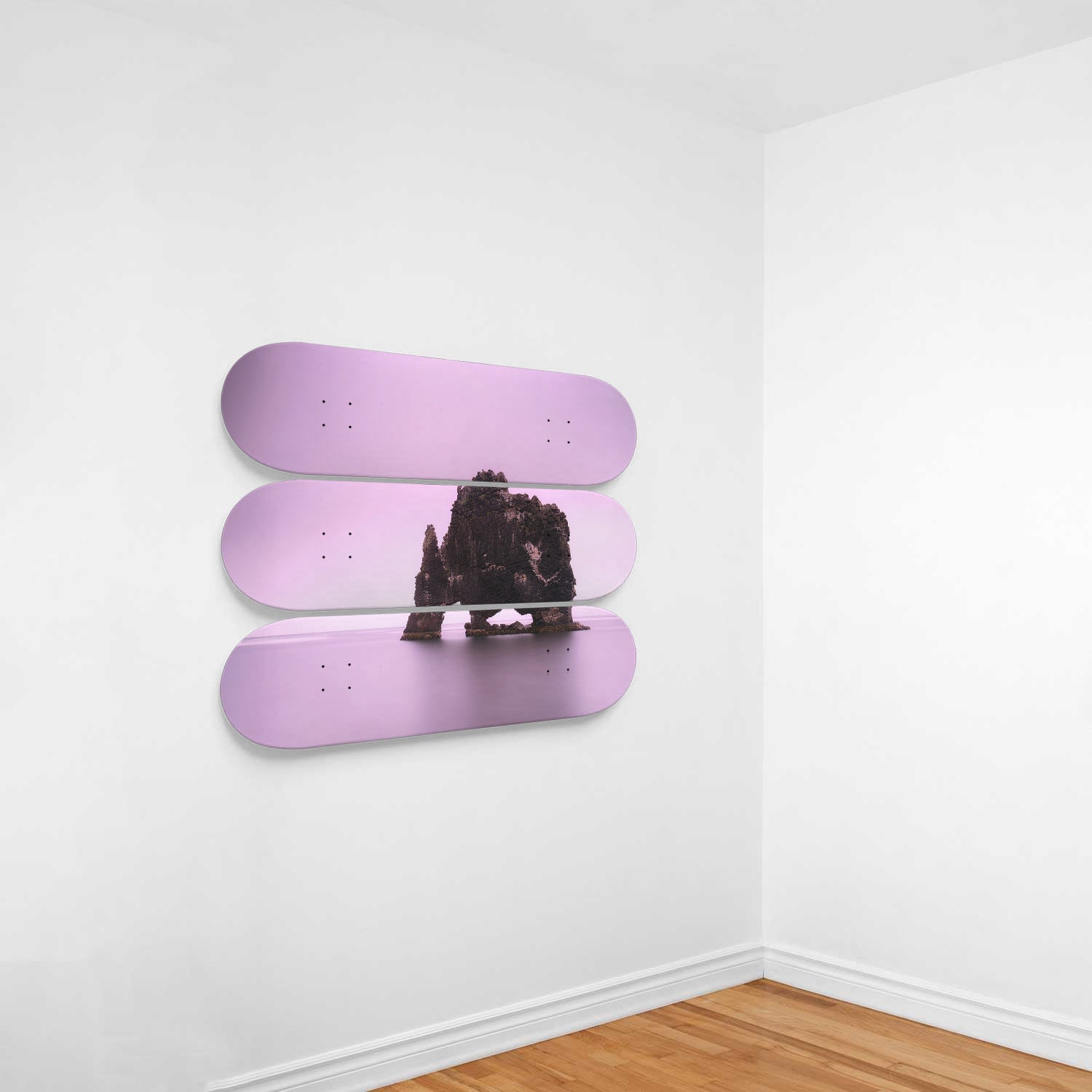 This set of 3 high-quality 7-ply 100% maple skateboards are the perfect statement piece for any home or office. Custom printed graphics, one-of-a-kind art piece.