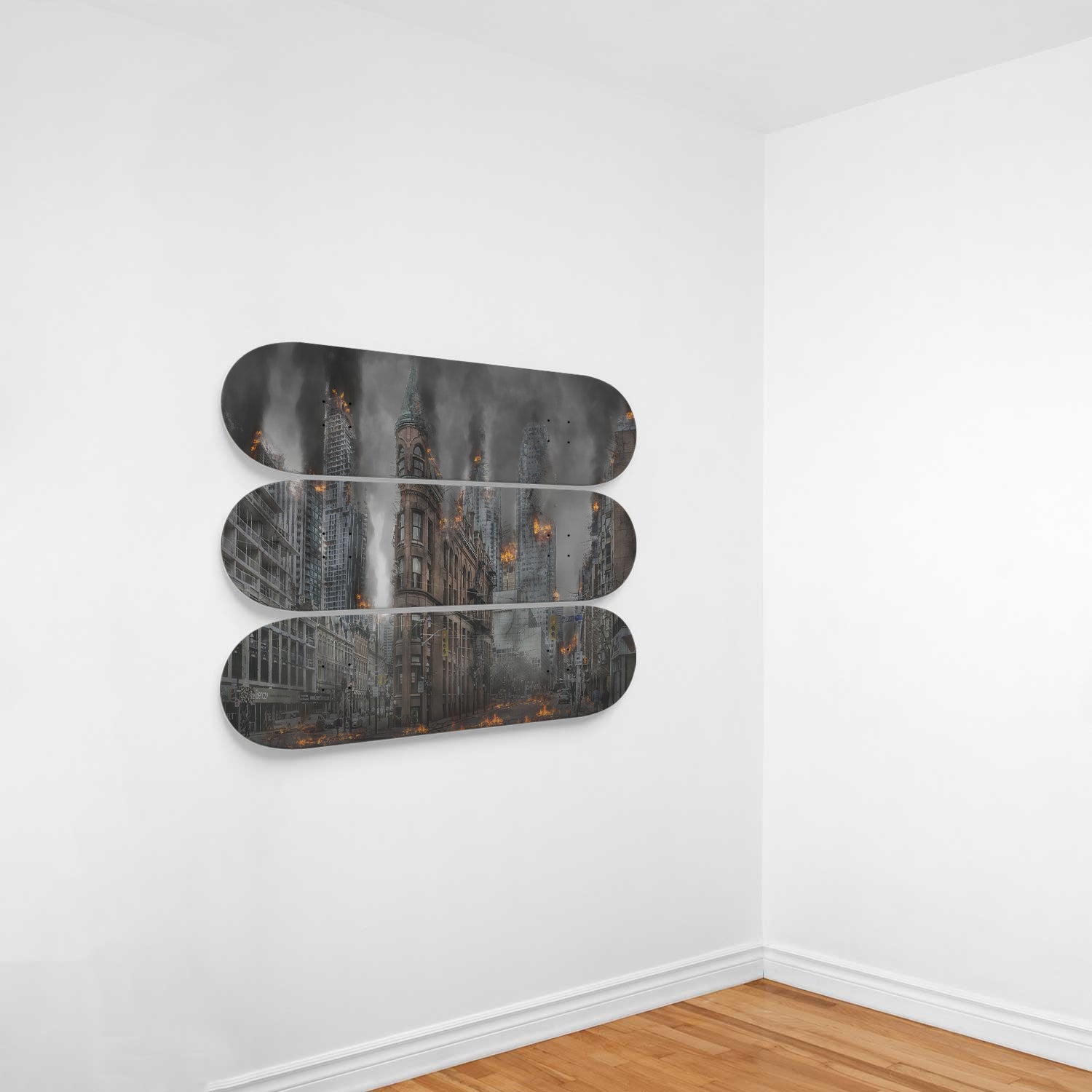 This set of 3 high-quality 7-ply 100% maple skateboards are the perfect statement piece for any home or office. Custom printed graphics, one-of-a-kind art piece.