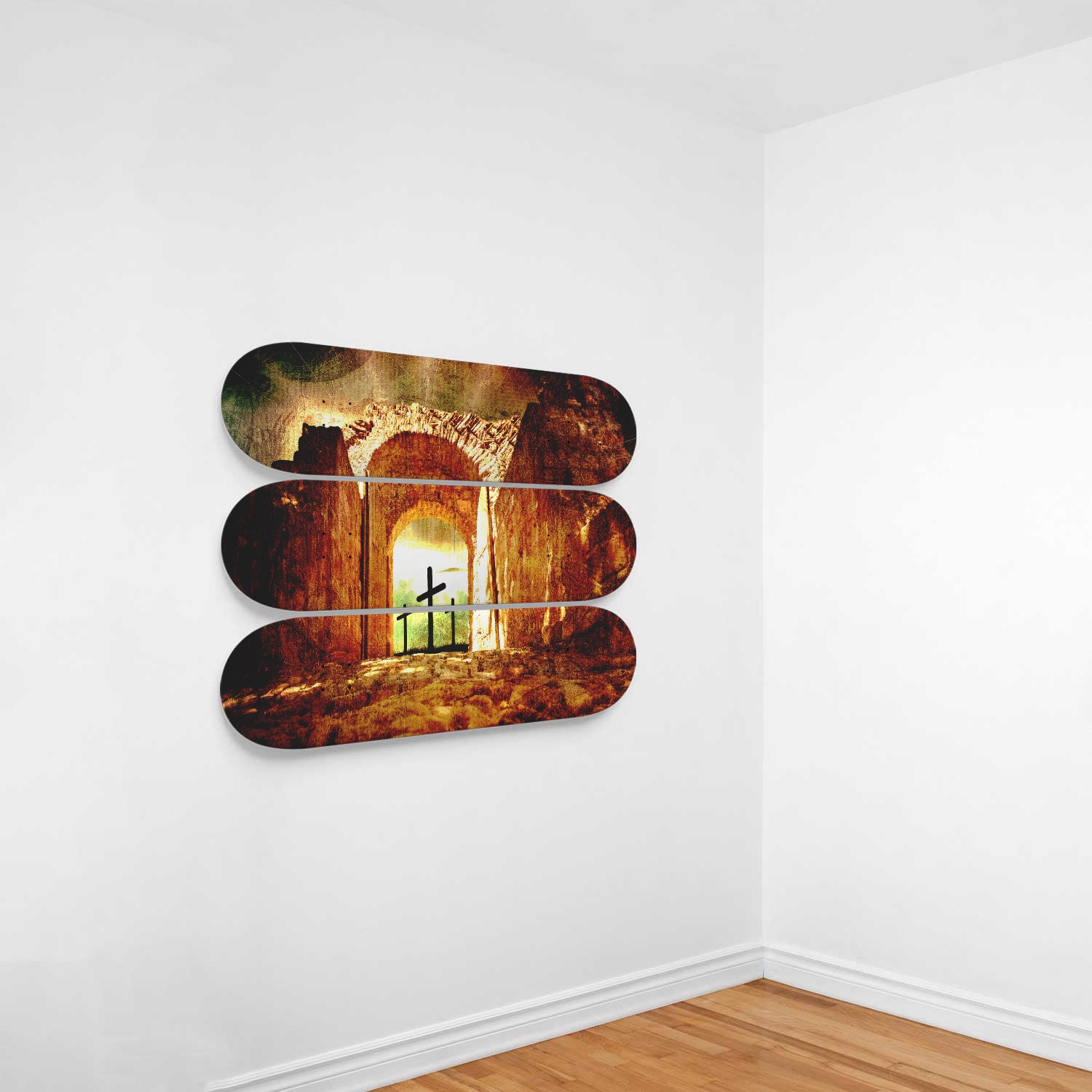 This set of 3 high-quality 7-ply 100% maple skateboards are the perfect statement piece for any home or office. Custom printed graphics, one-of-a-kind art piece.