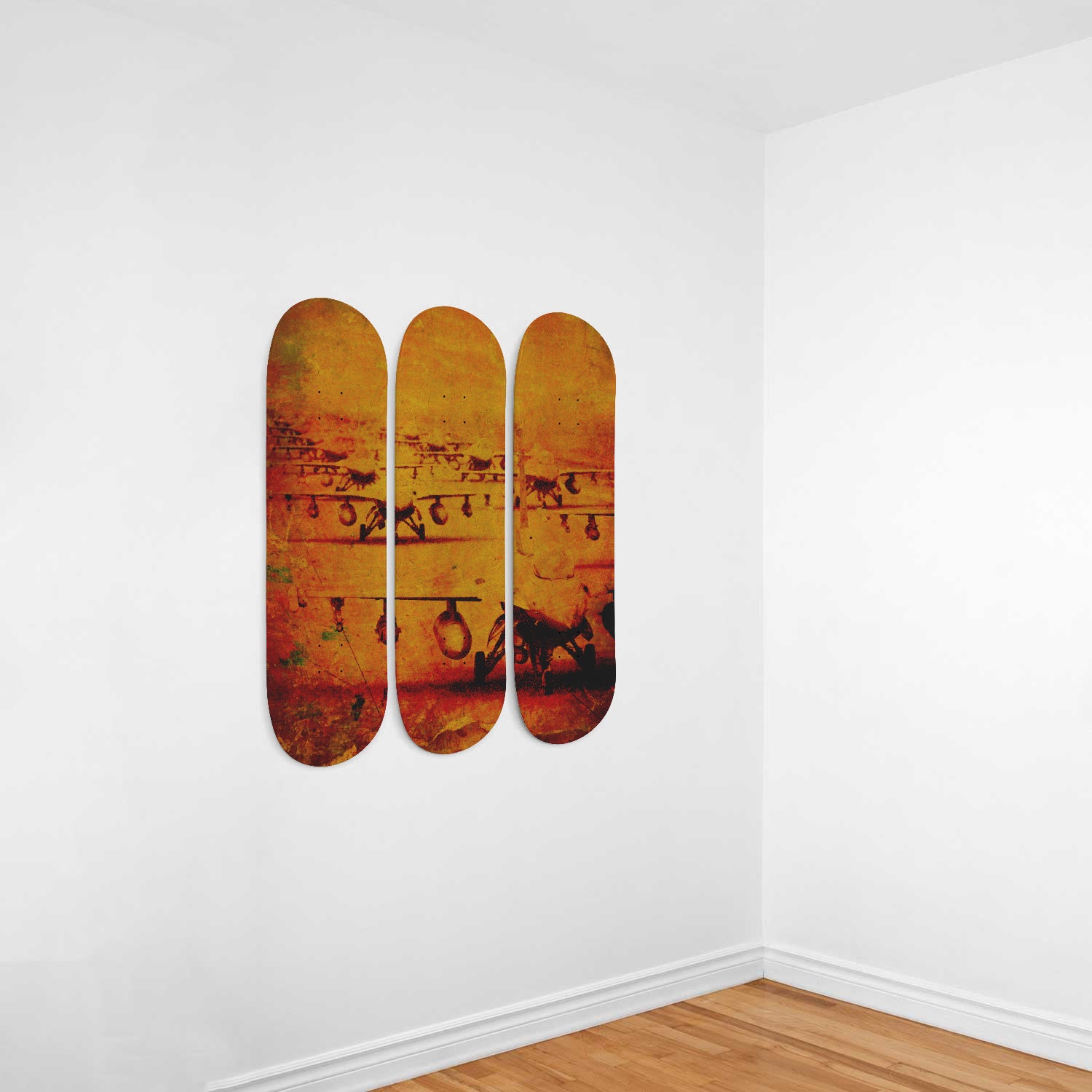 This set of 3 high-quality 7-ply 100% maple skateboards are the perfect statement piece for any home or office. Custom printed graphics, one-of-a-kind art piece.